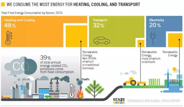 目前全球對化石燃料發電仍提供大量的補貼,但對新增可再生能源發電的投資已超過對新增化石燃料和核能發電投資總和的兩倍以上。 由于成本競爭力的提高,2017年可再生能源投資占電力行業總投資的比例超過三分之二,同時可再生能源在電力行業的份額仍將會繼續上升。可再生能源的投資區域性集中: 2017年,中國、歐洲和美國對可再生能源的投資占全球可再生能源投資總額的近75%。然而,當測量單位國內生產總值(GDP)時,馬紹爾群島、盧旺達、所羅門群島、幾內亞比紹和許多其他發展中國家對可再生能源的投資比例卻遠高于發達國家和新興經濟體。能源需求和能源相關的二氧化碳排放量四年來首次大幅增加。 由于新興經濟體的經濟增長和人口增長,全球能源需求在2017年增長了2.1%,能源相關的二氧化碳排放量增加了1.4%??稍偕茉丛鲩L實現的二氧化碳減排,無法抵消不斷增長的能源需求以及對化石和核能持續投資所造成的排放增量。電力行業面向可再生能源的轉型正在進行中,但轉型的速度比原本可能的或理想的要慢得多。2015年巴黎氣候協定做出的將全球氣溫上升限制在“遠低于”工業化前水平2攝氏度的承諾,使得這一挑戰更加突出。如果世界要實現巴黎協定中設定的目標,那么供熱、制冷和交通領域必須依照電力行業轉型的模式并以更快的速度進行能源轉型。當前這些領域:可再生能源在供熱和制冷領域的變化不大: 2015年,現代可再生能源為全球供暖體系提供了10% 左右的總熱量。相比于146個國家在電力行業制定了可再生能源目標,世界上只有48個國家制定了供熱和制冷領域的可再生能源國家目標。一些小變化正在發生。例如與2016年相比,2017年印度太陽能集熱器的安裝量增加了約25%。中國的目標是到2020年太陽能熱能提供2%的建筑制冷。