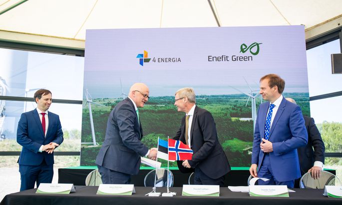 Eesti Energia周二在Paldiski Wind Park與Nelja Energia簽署了一項(xiàng)承諾協(xié)議。左起:VeikoRäim,AavoKärmas,Thorleif Leifsen和Hando Sutter