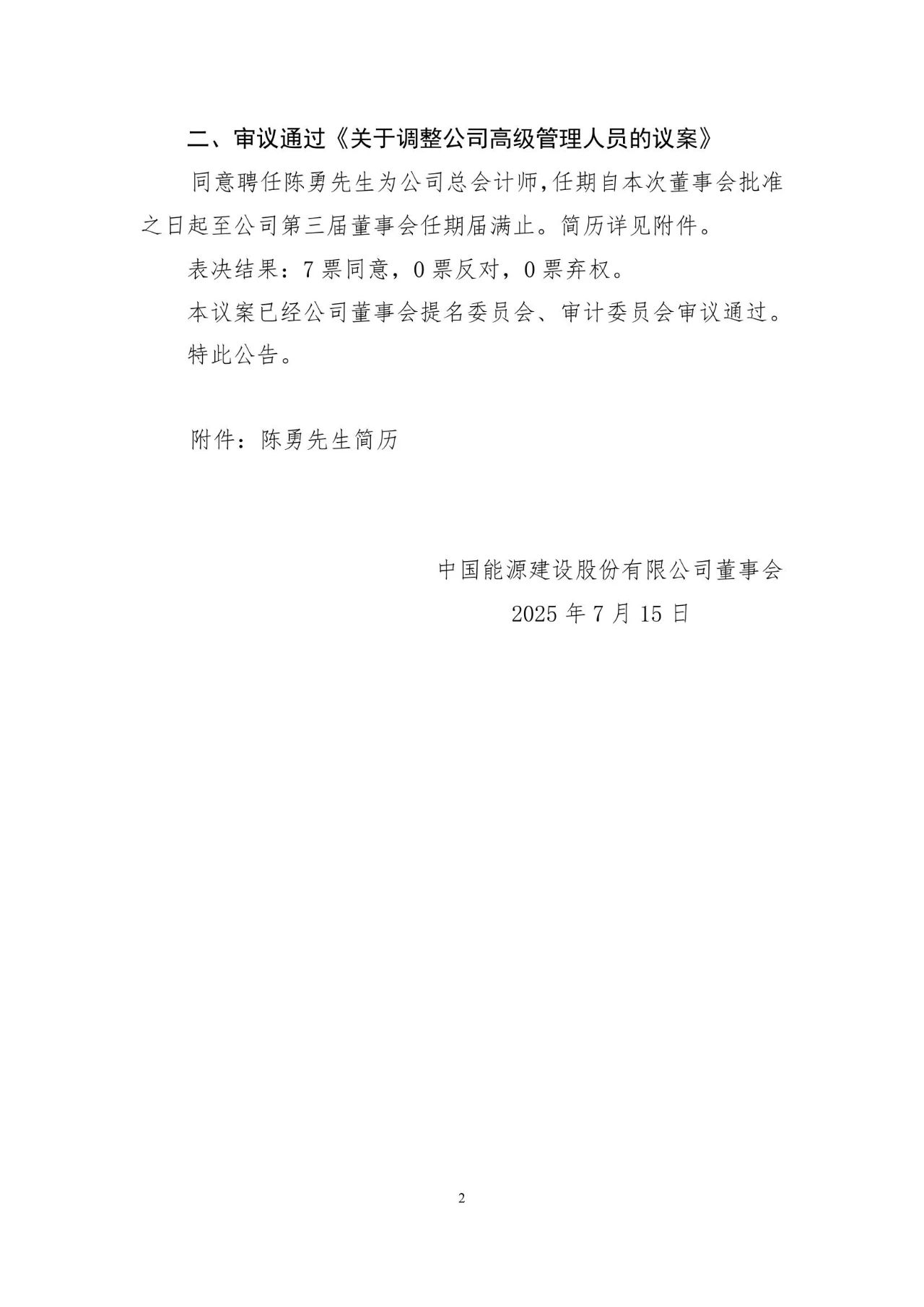 7月14日,中國能源建設(shè)集團(tuán)有限公司(以下簡稱“中國能建”)召開第三屆董事會第四十九次會議,審議通過《關(guān)于調(diào)整公司高級管理人員的議案》,同意聘任陳勇先生為公司總會計(jì)師,任期自本次董事會批準(zhǔn)之日起至公司第三屆董事會任期屆滿止。