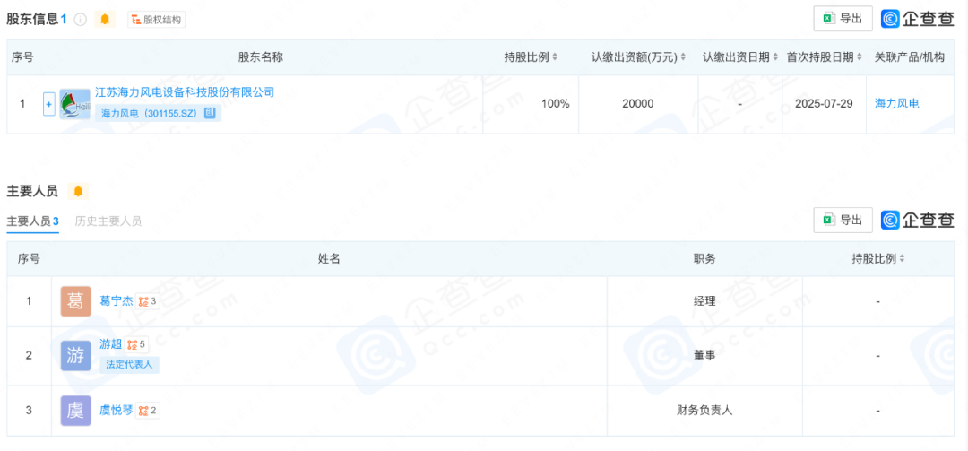 近日,海力海上風電裝備(溫州)有限公司成立,法定代表人為游超,注冊資本為20000萬元。新公司經(jīng)營范圍包含:新能源原動設(shè)備制造;海上風電相關(guān)裝備銷售;海洋工程裝備制造;海洋工程裝備銷售;海洋工程平臺裝備制造;海洋能系統(tǒng)與設(shè)備銷售;海洋能系統(tǒng)與設(shè)備制造;海洋工程關(guān)鍵配套系統(tǒng)開發(fā);海上風電相關(guān)系統(tǒng)研發(fā);風電場相關(guān)系統(tǒng)研發(fā);風電場相關(guān)裝備銷售等。企查查股權(quán)穿透顯示,該公司由江蘇海力風電設(shè)備科技股份有限公司100%持股。