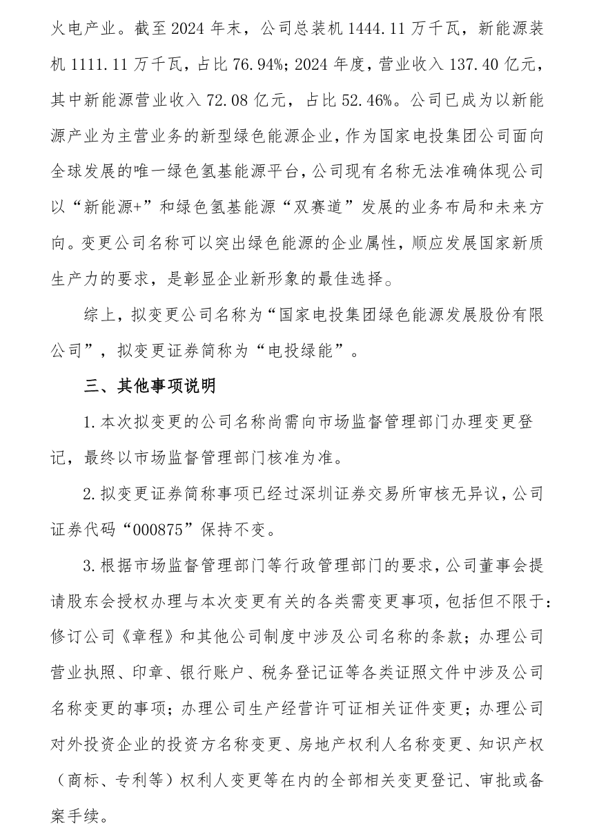 吉電股份發布公告稱,公司于8月20日召開第九屆董事會第三十四次會議,審議通過了《關于變更公司名稱及證券簡稱的議案》,擬變更公司名稱為國家電投集團綠色能源發展股份有限公司,擬變更證券簡稱為電投綠能。