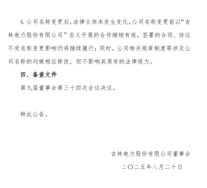 吉電股份發布公告稱,公司于8月20日召開第九屆董事會第三十四次會議,審議通過了《關于變更公司名稱及證券簡稱的議案》,擬變更公司名稱為“國家電投集團綠色能源發展股份有限公司”,擬變更證券簡稱為“電投綠能”。