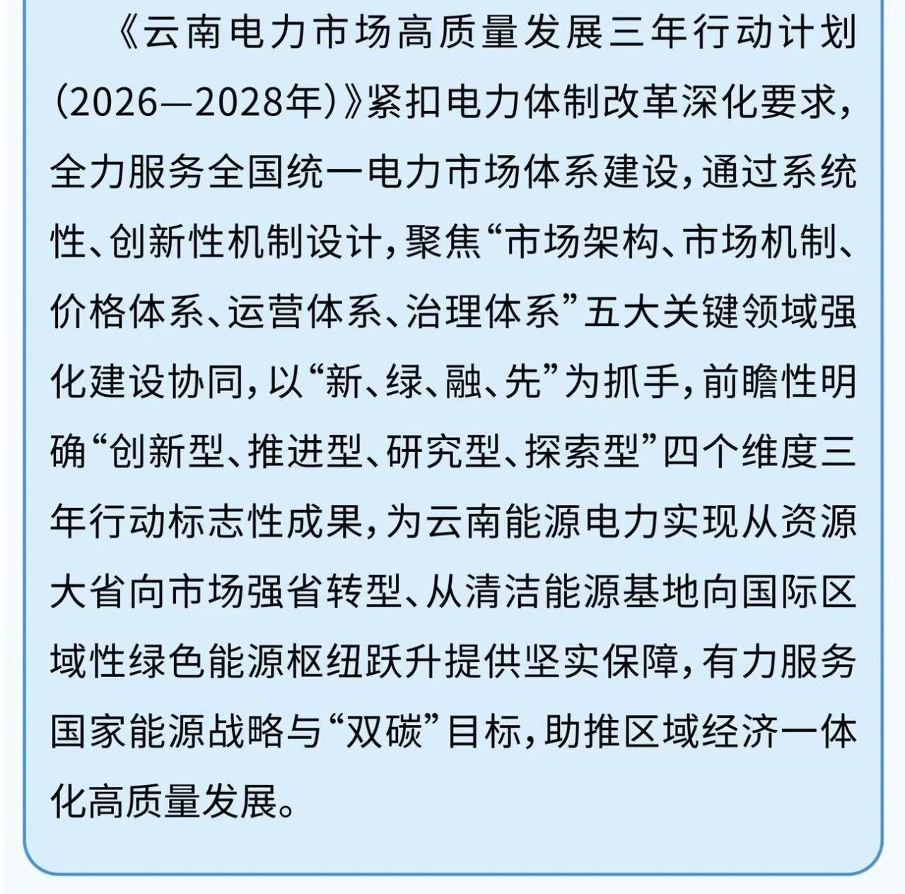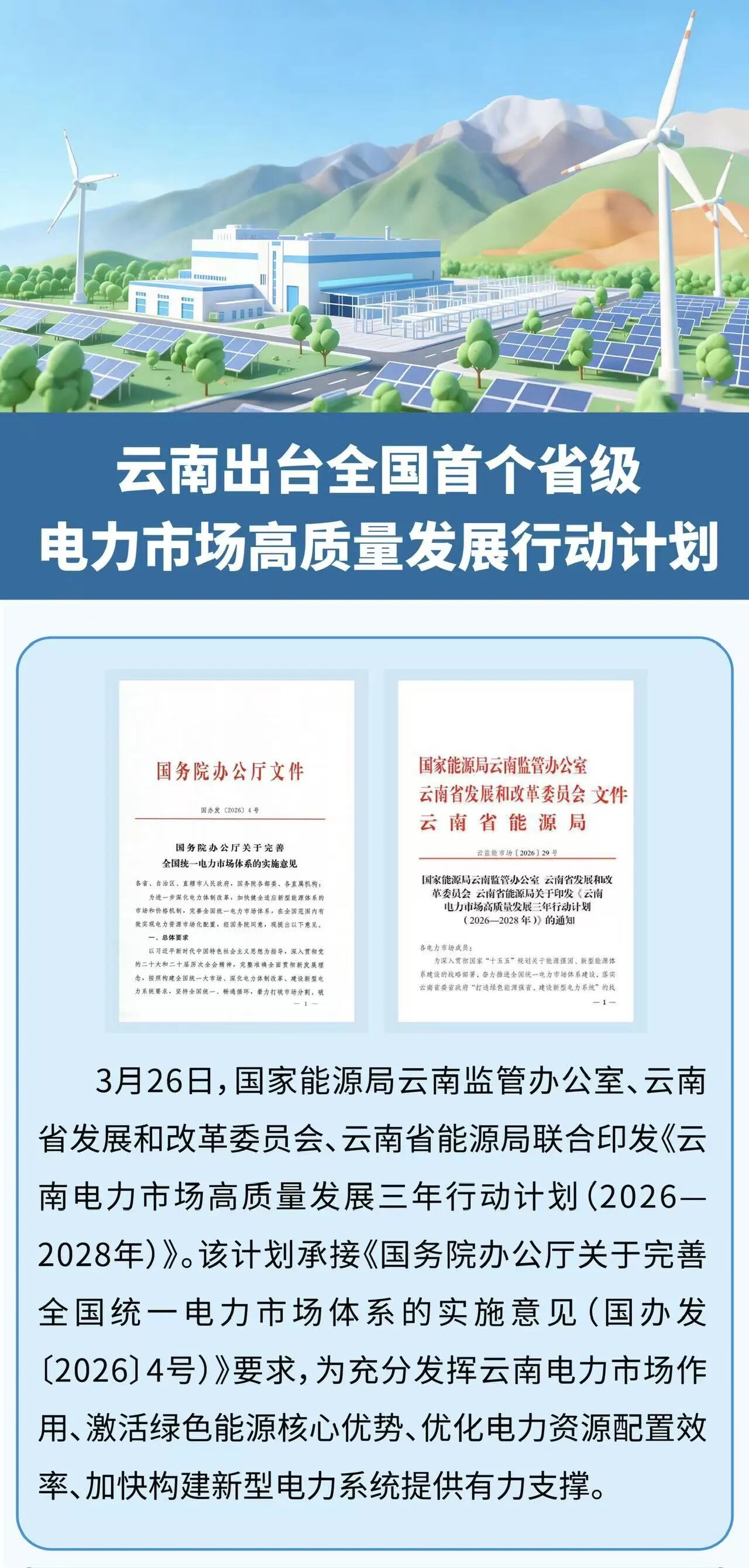 3月26日,國(guó)家能源局云南監(jiān)管辦公室、云南省發(fā)展和改革委員會(huì)、云南省能源局聯(lián)合印發(fā)《云南電力市場(chǎng)高質(zhì)量發(fā)展三年行動(dòng)計(jì)劃(2026一2028年)》。
