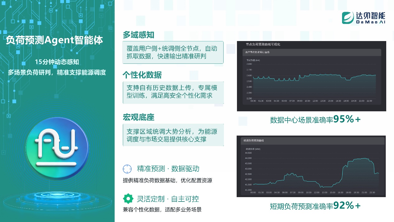 負(fù)荷預(yù)測(cè)Agent :針對(duì)數(shù)據(jù)中心、工業(yè)負(fù)荷等高精密場(chǎng)景實(shí)現(xiàn)動(dòng)態(tài)滾動(dòng)預(yù)測(cè),核心場(chǎng)景預(yù)測(cè)準(zhǔn)確率穩(wěn)定保持高位,精準(zhǔn)捕捉算力波動(dòng)與用電峰谷變化,為調(diào)度交易筑牢數(shù)據(jù)基礎(chǔ)。
