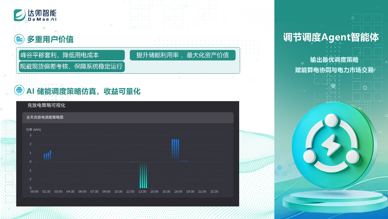 調(diào)節(jié)調(diào)度Agent :承擔(dān)算電協(xié)同與儲(chǔ)能管理核心職能,自動(dòng)生成最優(yōu)充放電策略,實(shí)現(xiàn)峰谷套利、負(fù)荷平抑,最大化儲(chǔ)能資產(chǎn)價(jià)值,并保障負(fù)荷運(yùn)行與電網(wǎng)接入雙穩(wěn)定。