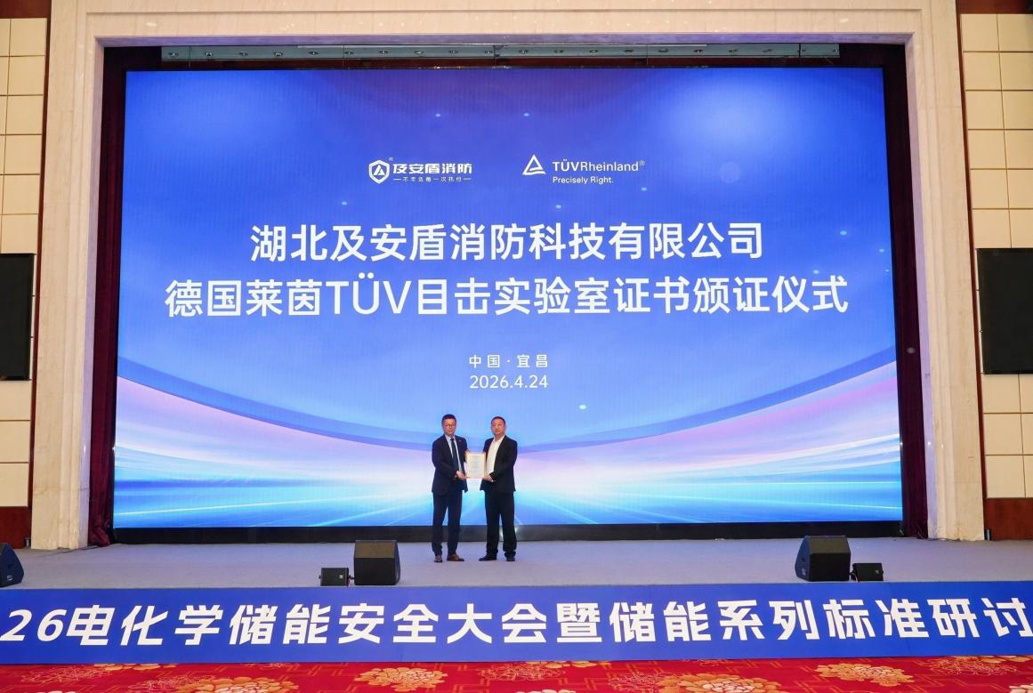同期,及安盾消防榮獲了“EN 15276目擊實驗室”的重磅認證,成為國內第一家獲得德國萊茵TÜV授權的EN 15276標準目擊實驗室。這標志著及安盾的測試能力與質量管理體系達到國際先進水平,為其儲能消防產品進入北美、歐洲、澳洲等海外市場提供了權威背書。