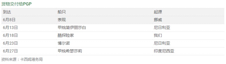巴基斯坦于5月在旁遮普地區(qū)的Haveli Bahadur Shah和Bhikki完成了兩座燃?xì)獍l(fā)電廠的投產(chǎn)。這產(chǎn)生了對六種液化天然氣貨物的充足需求,這些貨物已交付給PGP終端。位于旁遮普邦的Balloki的第三座發(fā)電廠預(yù)計(jì)將在未來幾個(gè)月內(nèi)啟動。這將為電網(wǎng)增加約3.6 GW的新容量,并有助于減少停電的可能性。