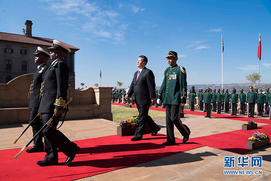 總統(tǒng)府前廣場,微風(fēng)拂面,陽光和煦。中南兩國國旗迎風(fēng)飄揚(yáng)。習(xí)近平和夫人彭麗媛受到拉馬福薩和夫人莫采佩熱情迎接。兩國元首夫婦登上檢閱臺。儀仗隊行持槍禮。軍樂隊奏中國國歌。現(xiàn)場鳴放21響禮炮。習(xí)近平檢閱儀仗隊。軍樂隊奏南非國歌。習(xí)近平和彭麗媛同南方主要官員握手。拉馬福薩夫婦同中方陪同人員握手。兩國元首夫婦親切寒暄。拉馬福薩對習(xí)近平在南中建交20周年之際訪問南非并出席金磚國家領(lǐng)導(dǎo)人會晤表示熱烈歡迎。
