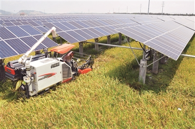 昨天,記者在基地看到,今年年初種下的300畝早稻已經(jīng)成熟,飽滿的稻穗隨著微風沙沙作響,而收割機正在田地里飛快地收割,田間地頭上方是一排排整齊的太陽能面板,正在將陽光變成源源不斷的電源。