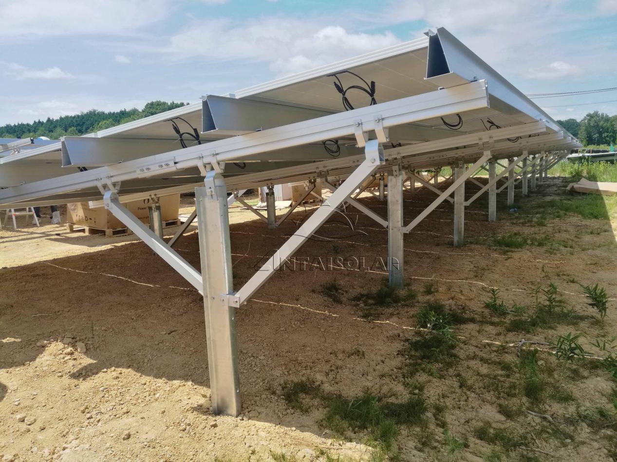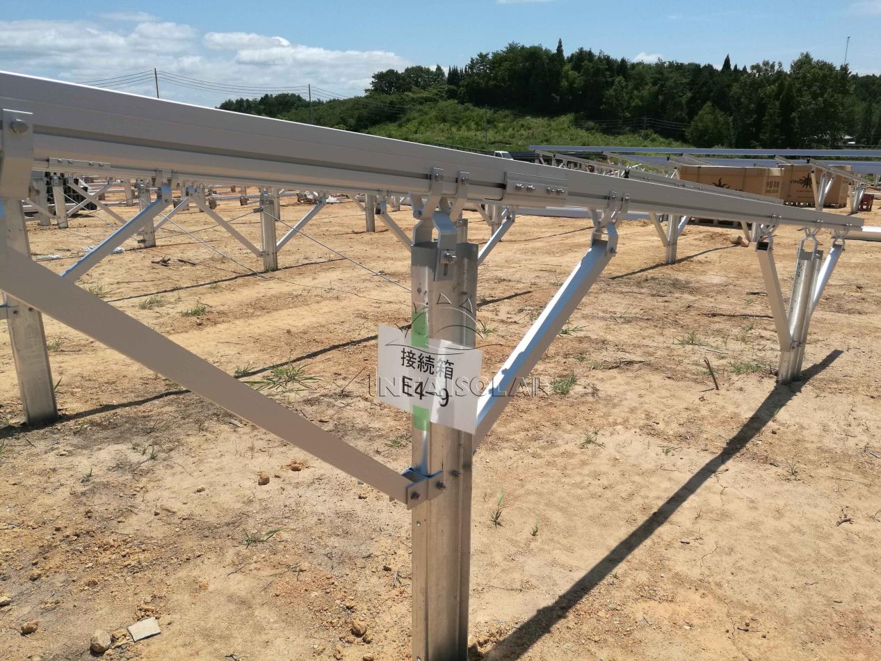 經(jīng)過多次討論,最終為項目設(shè)計了幾字樁坡地東西可調(diào)支架解決方案。該支架采用幾字雙樁+雙支撐的設(shè)計,能很好地適應(yīng)不同坡地地形;此外,利用大的跨距設(shè)計,結(jié)合打樁設(shè)備,充分提高了山地案件的施工效率。