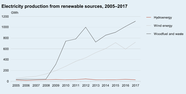 可再生能源的電力生產(chǎn)逐年增加,2017年的增長率與2016年相比增長了13%。風(fēng)電產(chǎn)量同比增長15%,占可再生電力總產(chǎn)量的近40%。木質(zhì)燃料和其他可再生能源的電力生產(chǎn)顯著增加(10%)。
