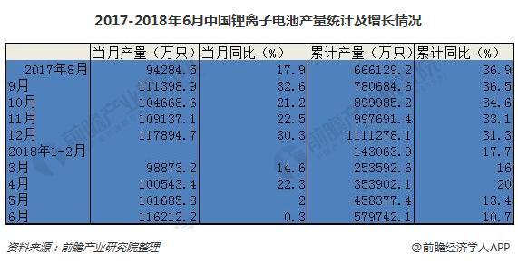 據(jù)前瞻產(chǎn)業(yè)研究院發(fā)布的《鋰電池行業(yè)市場(chǎng)需求預(yù)測(cè)與投資戰(zhàn)略規(guī)劃分析報(bào)告》統(tǒng)計(jì)數(shù)據(jù)顯示,2018年6月,中國(guó)鋰離子電池產(chǎn)量為116212.2萬(wàn)只,同比微增0.3%。2018年1-6月,全國(guó)鋰離子電池累計(jì)產(chǎn)量達(dá)579742.1萬(wàn)只,同比增長(zhǎng)10.7%。