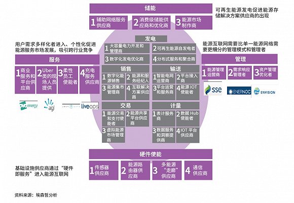 除了傳統(tǒng)的電力發(fā)、輸、配、售、調(diào)度外,能源互聯(lián)網(wǎng)中還出現(xiàn)了六類新玩家:交易、表記數(shù)據(jù)應(yīng)用、能源服務(wù)、能源管理、能源存儲(chǔ)、使能技術(shù)。即使是傳統(tǒng)價(jià)值鏈中的角色,也細(xì)分出了數(shù)字化發(fā)電優(yōu)化供應(yīng)商、分布式能源服務(wù)商和能源聚合商等新角色。