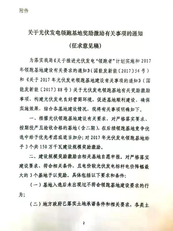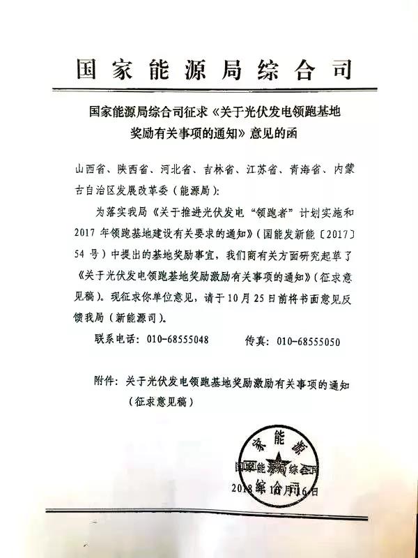 從國家能源局綜合司處獲悉,該局在日前印發(fā)了征求《關(guān)于光伏發(fā)電領(lǐng)跑基地獎勵有關(guān)事項的通知》意見的函,就國能發(fā)新能【2017】54號中提出的領(lǐng)跑者基地獎勵事宜征求相關(guān)發(fā)改委(能源局)的意見。