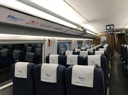 專列,“天合光能號”的車身、內外車門、行李架、頭巾和小桌板等位置均印有天合光能企業標識和“與光同行,‘誠’就夢想”的口號,以及天合光能在家用光伏、商用光伏、能源互聯網等領域的業務展示。