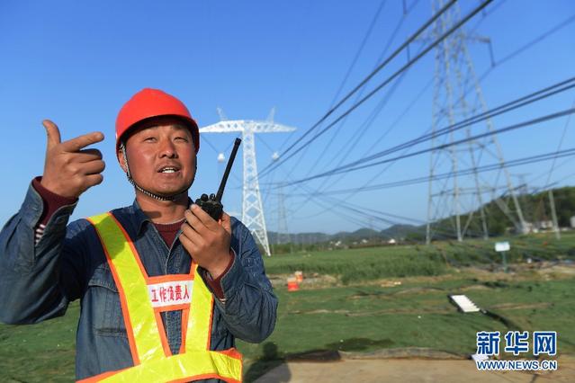 4月8日,在安徽省蕪湖市繁昌縣境內,安徽送變電工程有限公司施工人員在指揮工程導線展放施工。