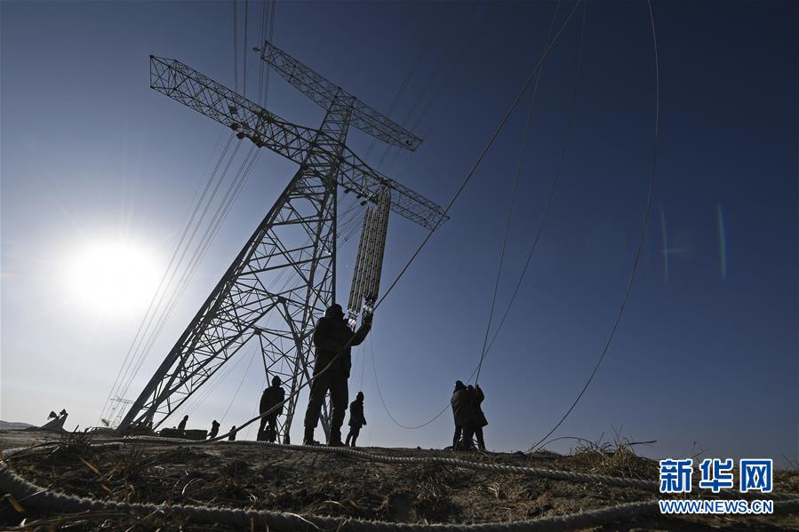 在昌吉——古泉±1100千伏特高壓直流輸電工程寧夏固原段,施工人員進行線路貫通結尾工程作業