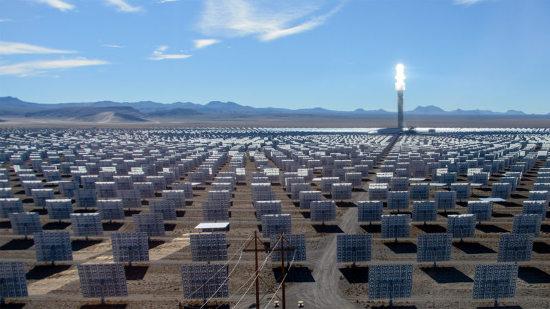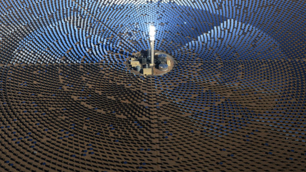 該場域?qū)仢M12,000面鏡子,利用鏡子聚集太陽光至中央220米的高塔,其內(nèi)部熔鹽(moltensalt)將加熱到攝氏565度,并利用熱交換器(heatexchanger)將熱能轉(zhuǎn)移至水中產(chǎn)生蒸氣,可用于蓄熱或是用蒸氣來驅(qū)動發(fā)電機(jī)。