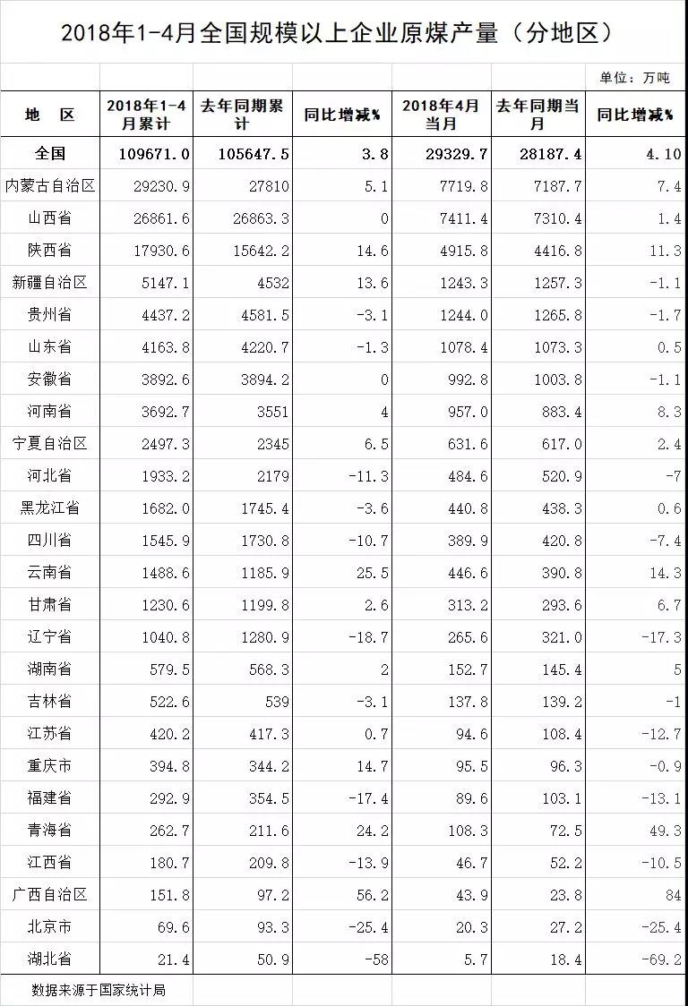 1-4月全國(guó)規(guī)模以上企業(yè)原煤產(chǎn)量 (分地區(qū))